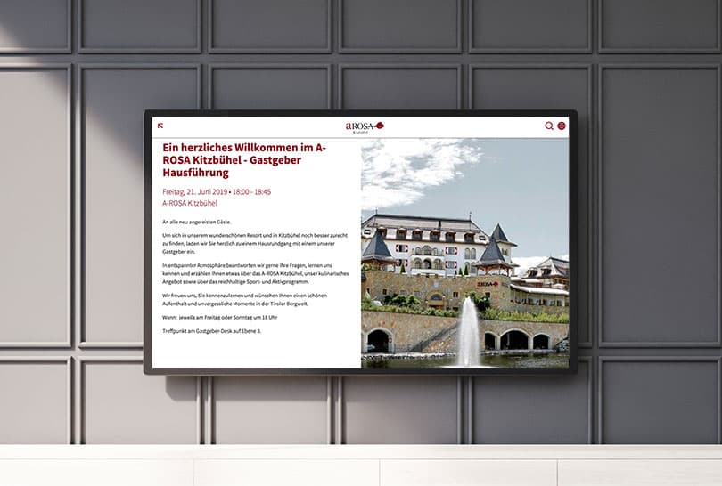 The screens in the spa may need to display different content than the monitors in the lobby. Hotel MSSNGR can process any number of different feeds. Hotel MSSNGR fulfils all requirements for the display of the content in multiple languages.