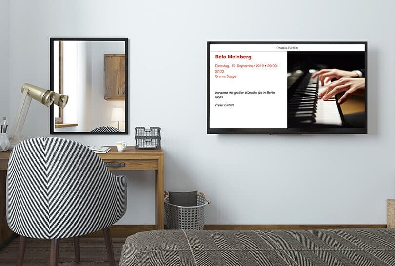 Hotel MSSNGR delivers all communication content for your guests to the televisions in the room. Hotel MSSNGR enables guests to view curated guest information in the form of a slide show on their in-room TVs. Our sophisticated content engine delivers site-specific content. Multilingual support is provided by default. Hotel MSSNGR’s in-room TV solution works with standard hotel TV broadcast systems and typically does not require any additional investment.